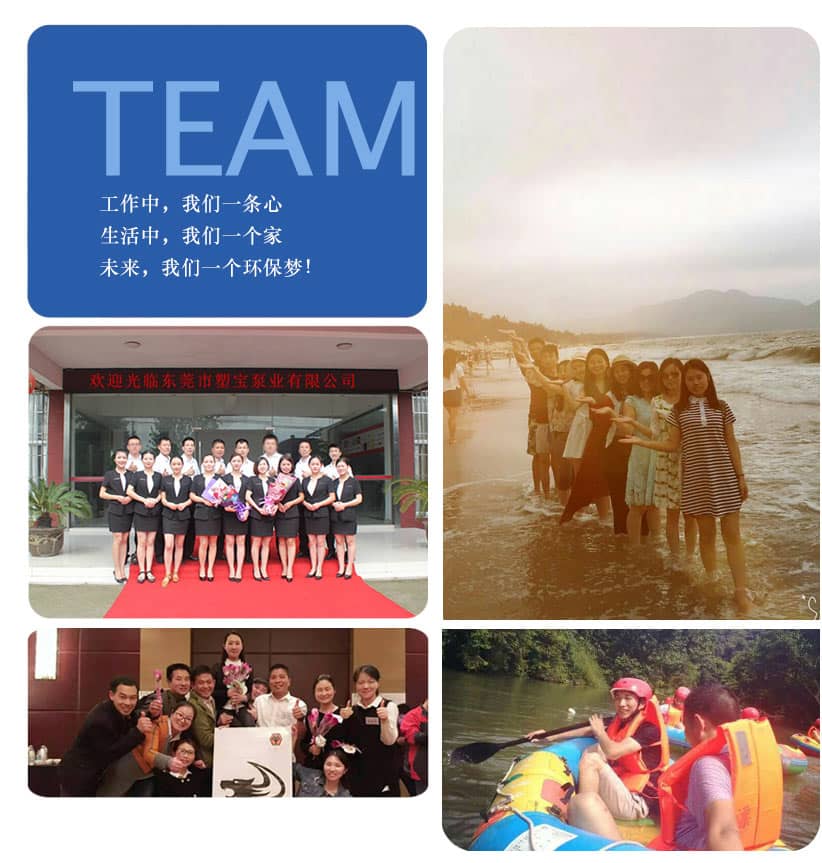 團(tuán)隊(duì)風(fēng)采》》東莞市塑寶泵業(yè)有限公司擁有強(qiáng)大的生產(chǎn)研發(fā)團(tuán)隊(duì)、經(jīng)驗(yàn)豐富的售后服務(wù)團(tuán)隊(duì)及營銷型人才,公司員工擁有大專以上學(xué)歷,團(tuán)隊(duì)保持“年輕、活力、向上”的風(fēng)貌,迎合了東莞市塑寶泵業(yè)有限公司對“污水環(huán)保夢”的追求,公司注重人才培養(yǎng)策略,為員工設(shè)立人性化的福利制度,并定期為員工報名高等培訓(xùn)課程,見證了“學(xué)習(xí)永不止步”的人才理念。